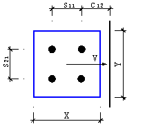 式中 ---- 群锚中受力最大锚栓的拉力设计值; ---- 群锚受拉区总拉力设计值; ---- 群锚中受力最大锚栓的剪力设计值; ---- 群锚总剪力设计值; ---- 锚栓受拉承载力设计值; ---- 锚栓受拉承载力标准值; ---- 锚栓受剪承载力设计值; ---- 锚栓受剪承载力标准值; ---- 混凝土锥体受拉破坏承载力设计值; ---- 混凝土锥体受拉破坏承载力标准值; ---- 混凝土楔形体受剪破坏承载力设计值; ---- 混凝土楔形体受剪破坏承载力标准值; γRs,N----锚栓钢材受拉破坏,锚固承载力分项系数=2.00; γRs,V----锚栓钢材受剪破坏,锚固承载力分项系数=2.00; γRc,N----混凝土锥体受拉破坏,锚固承载力分项系数=2.15; γRc,V----混凝土楔形体受剪破坏,锚固承载力分项系数=1.80; γRcp----混凝土剪撬受剪破坏,锚固承载力分项系数=1.80; γRsp----混凝土劈裂受拉破坏,锚固承载力分项系数=2.15; 锚栓的分布如下图所示
